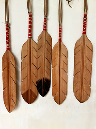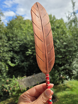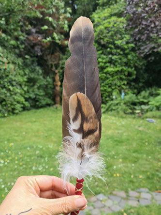 Zum Räuchern gehört eigentlich eine Feder oder ein Federfächer. So haben wir auf viel Anfragen auch für unsere Freunde und Kunden einige gefertigt. So entstanden auch die einizgartigen Federn aus Rotzeder.