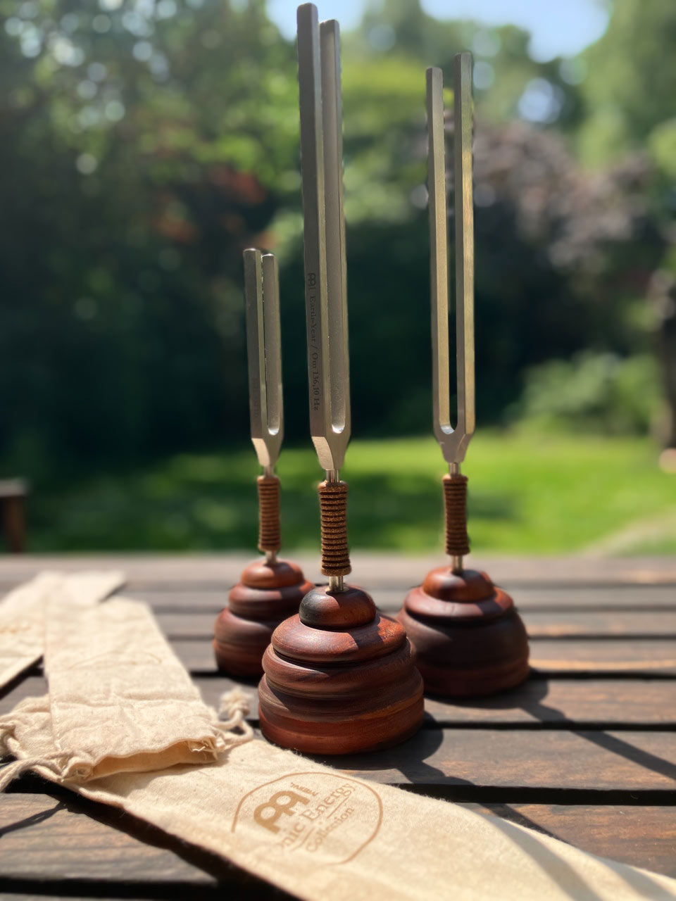 Aus Erfahrung heraus empfehlen wir die therapeutischen Stimmgabeln von Meinl. Sie sind im Gegensatz zu den Standard-Stimmgabeln größer & schwerer und schwingen intensiver & länger!