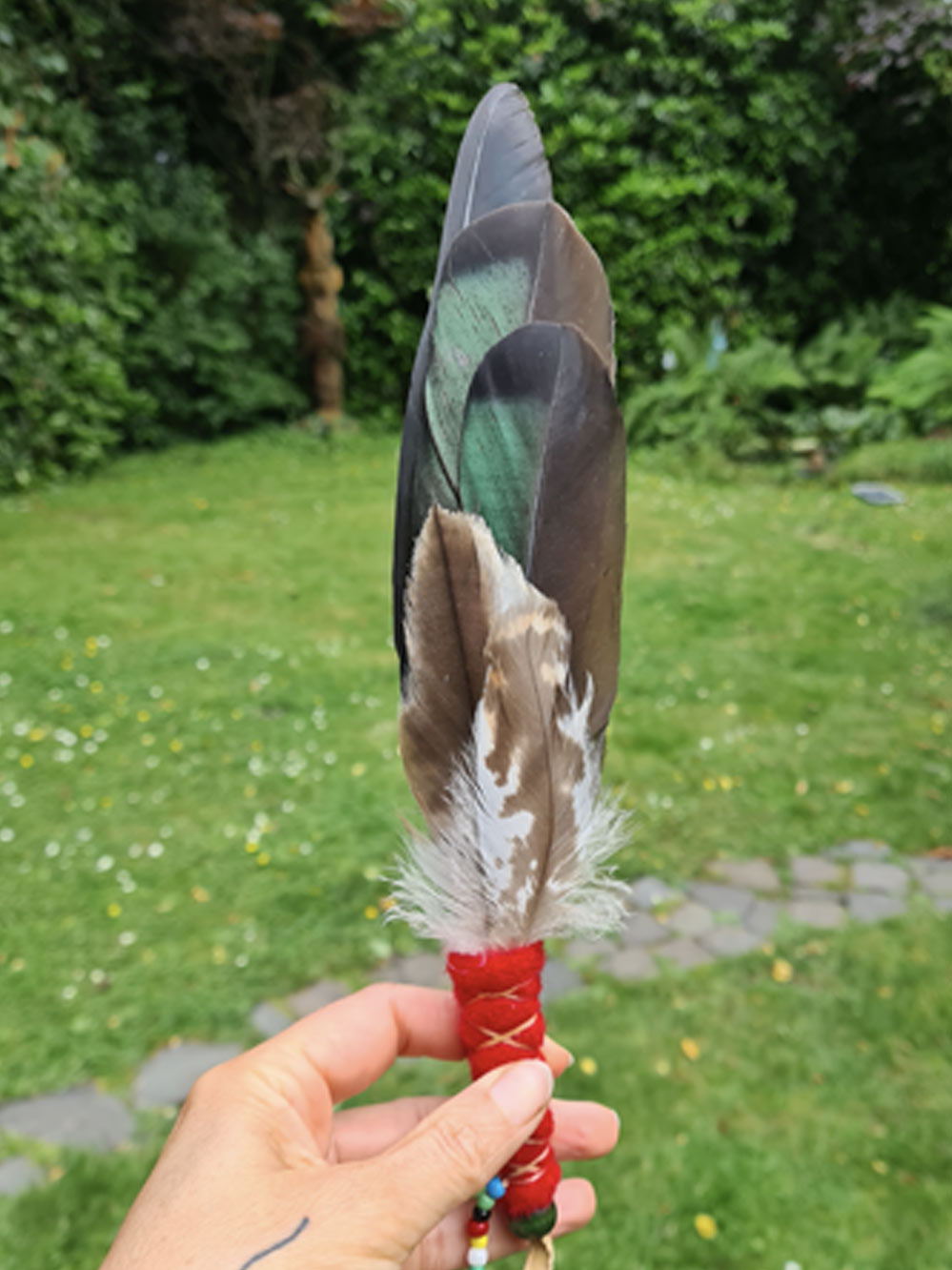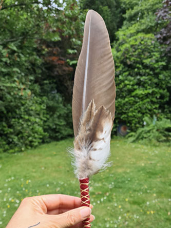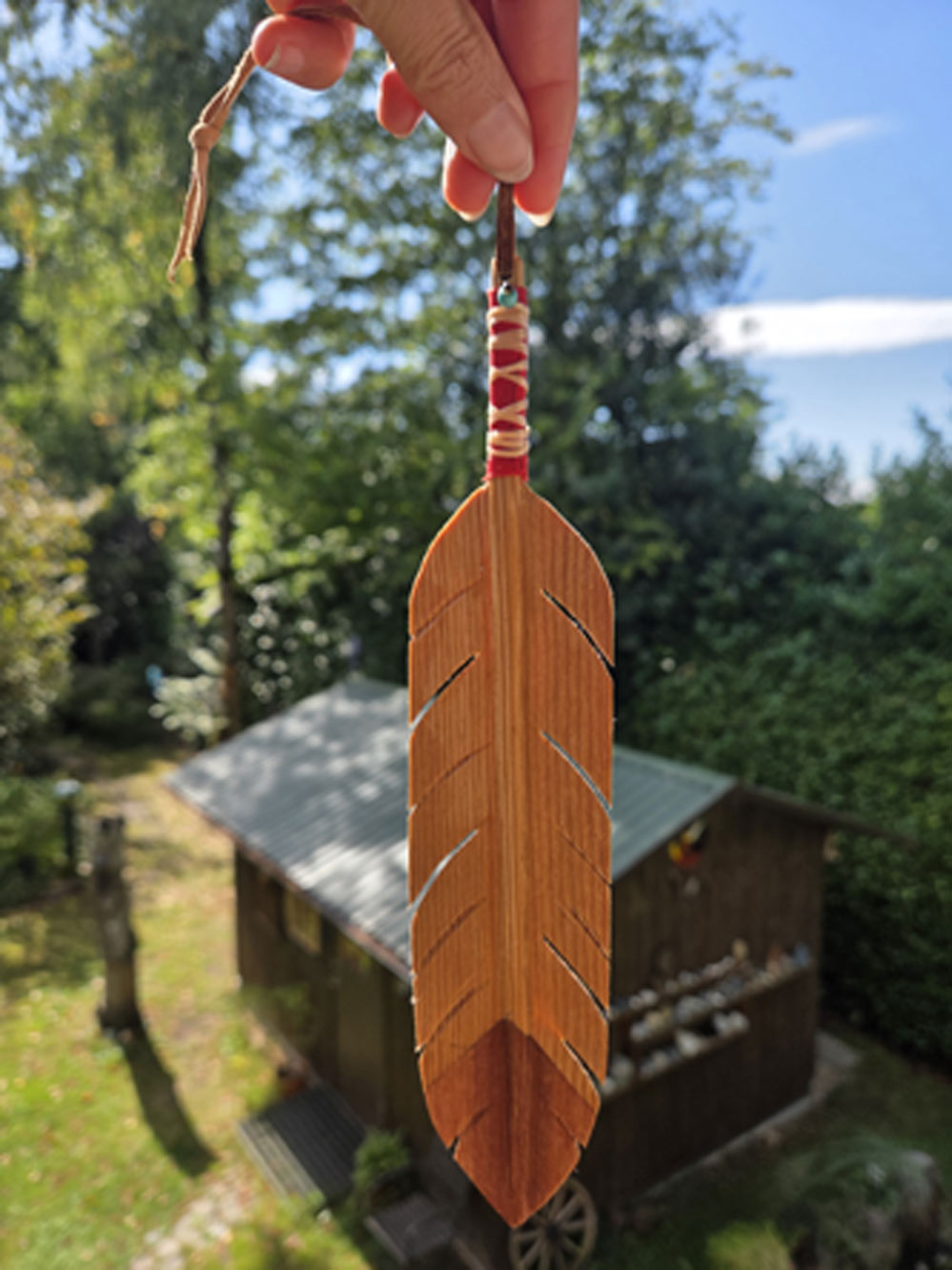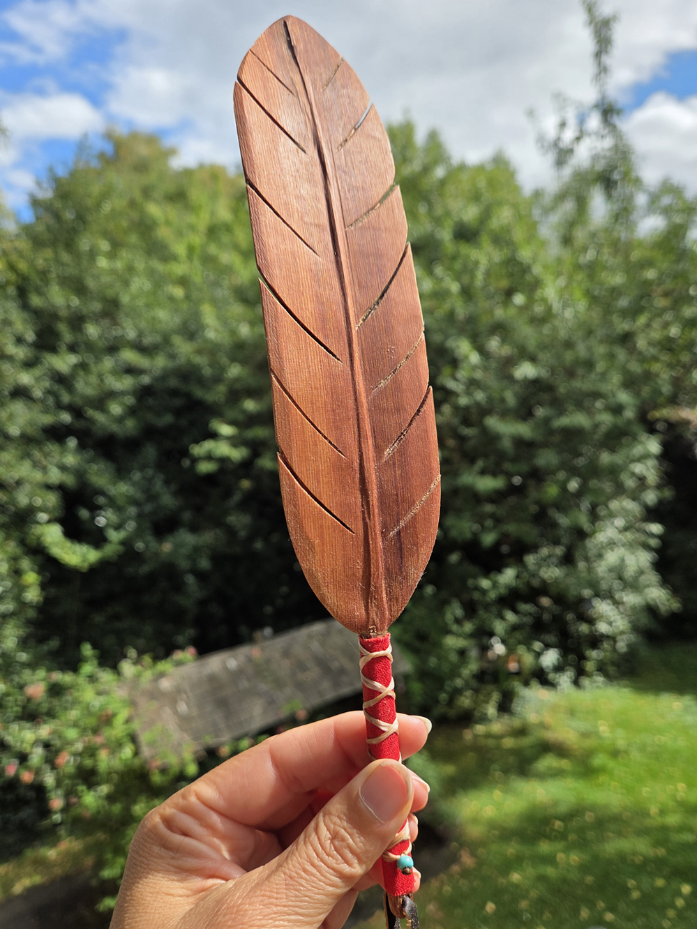 Zum Räuchern gehört eigentlich eine Feder oder ein Federfächer. So haben wir auf viel Anfragen auch für unsere Freunde und Kunden einige gefertigt. So entstanden auch die einizgartigen Federn aus Rotzeder.