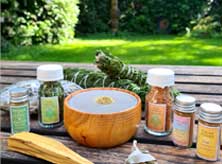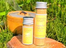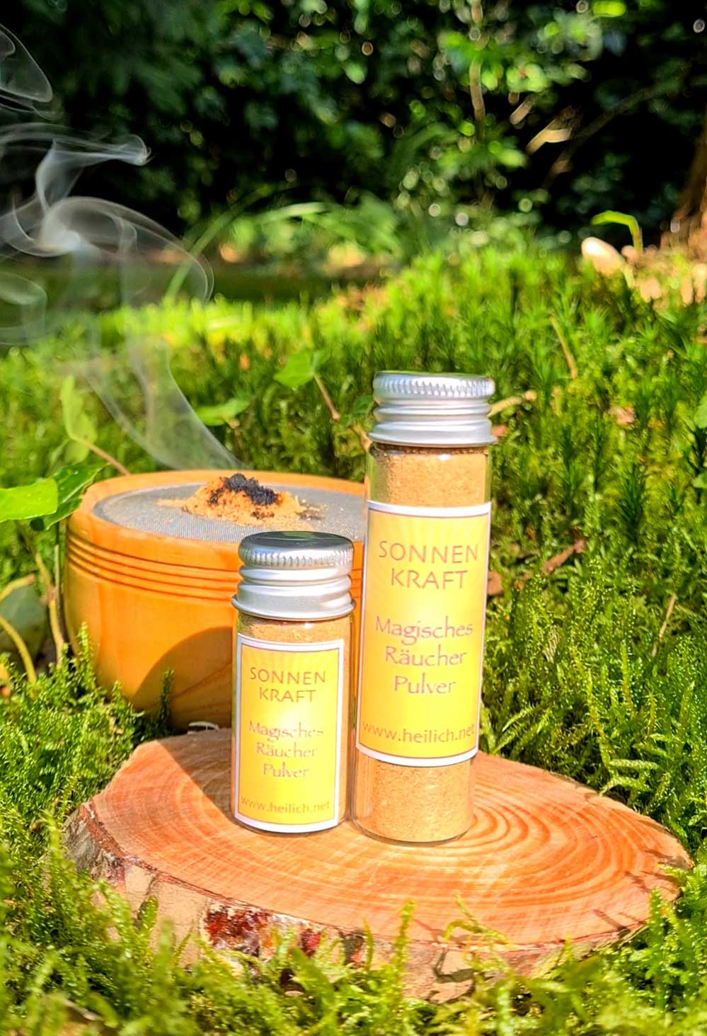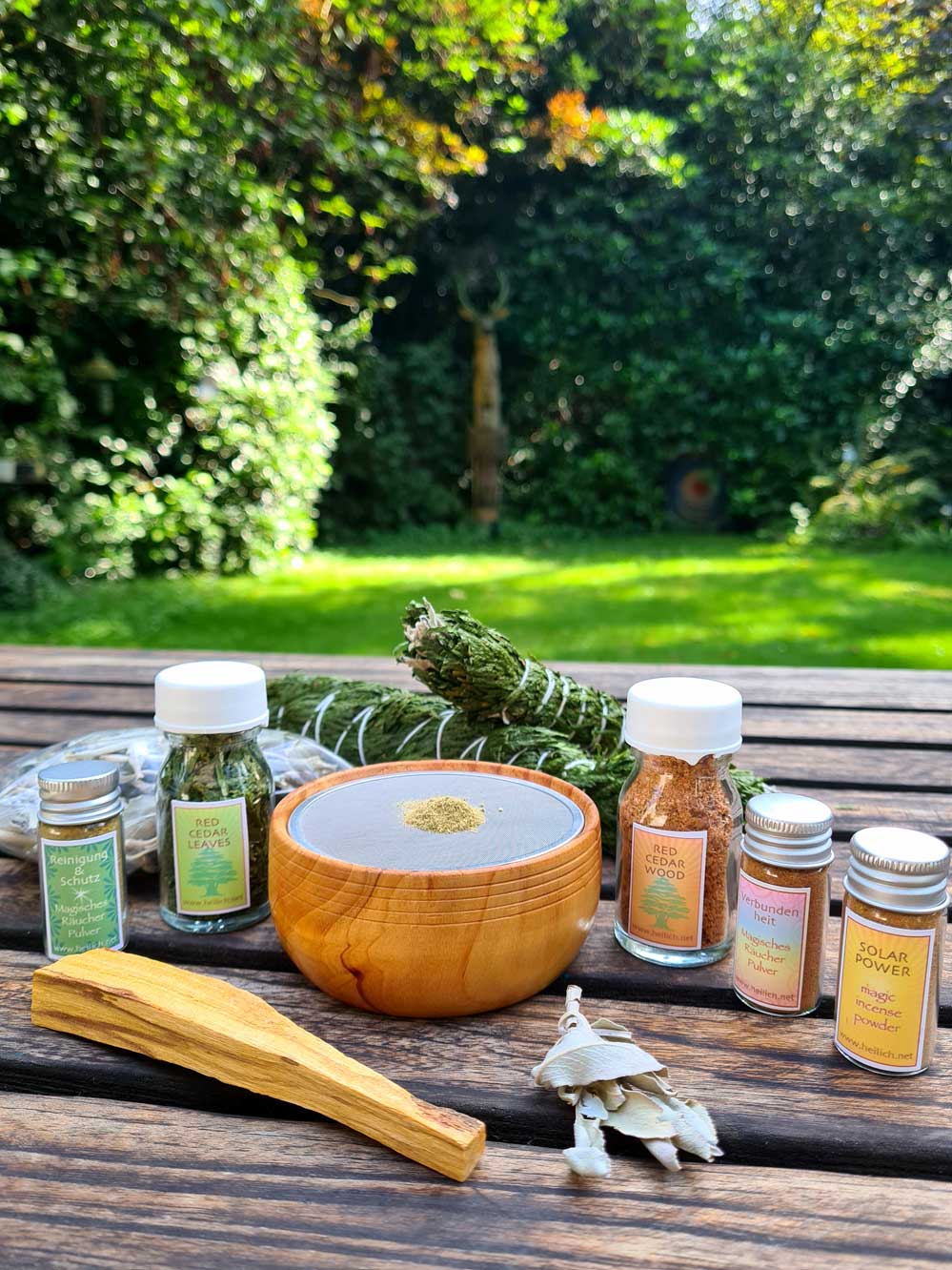 Unsere speziellen Räuchermischungen in Pulverform stellen wir aus hochwertigen, natürlichen, zum Teil seltenen Inhaltsstoffen zusammen. So haben wir im Laufe der Zeit mit Erfahrung und Liebe einige Mischungen mit speziellen Eigenschaften oder auch zu traditionellen Jahreskreisfesten kreiert. Diese selbstglimmenden Kreationen werden direkt angezündet ohne Verwendung von Kohle oder Kerzen, am besten auf einer unserer handgedrechselten Schalen aus edlen Hölzern. Hier wird das Räucherpulver sparsam angehäuft auf das sehr feinmaschige Sieb gegeben und entzündet. Durch die Sauerstoffzufuhr von unten glimmt und entfaltet sich der Duft des Räucherpulvers ideal in seiner reinsten Form - ohne Parafin- oder Kohlegeruch. Die Eigenschaften und Wirkung der Kräuter bleiben optimal erhalten. Diese Räucherpulver sind ebenfalls unterwegs im Outdoorbereich sehr einfach nutzbar.